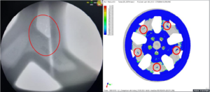Above figure demonstrates defect mapping of blow holes defect for LPDC process with ADSTEFAN die casting simulation software. We have simulated flow pattern and blue color in image represents air inside cavity during filling and transparent color represents already filled molten metal at these areas. The root cause of defect is identified as air pocket isolations during filling which is highlighted are observed in casting in ADSTEFAN Low pressure die casting simulation. Due to this air pocket isolation is observed in cavity which leads air gets entrapped between the molten metal and thus forms as Gas porosity in casting and same phenomenon is observed in shop floor trails.