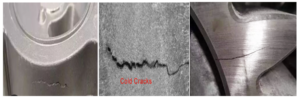 Figure – Hot crack, cold crack and fatigue crack from left to right