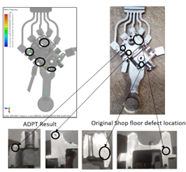 We have observed that probability of Shrinkage porosity defect in Project B. Actual shop floor pouring is done based on model considered in Project B and we have observed Shrinkage porosity defect in locations identified as per ADPT results. Fig 1.4 shows comparison between shop floor defect results and ADPT results.